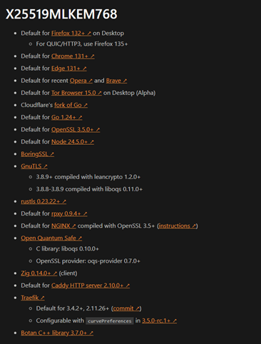 Im OpenSSL gibt es schon seit Jahren Implementierungen der Vorläufer Kyber, Dilithium, Falcon, … die nun auf die Standards umgestellt wurden und werden.